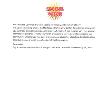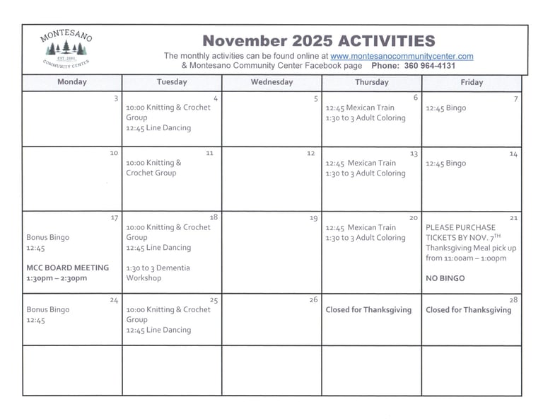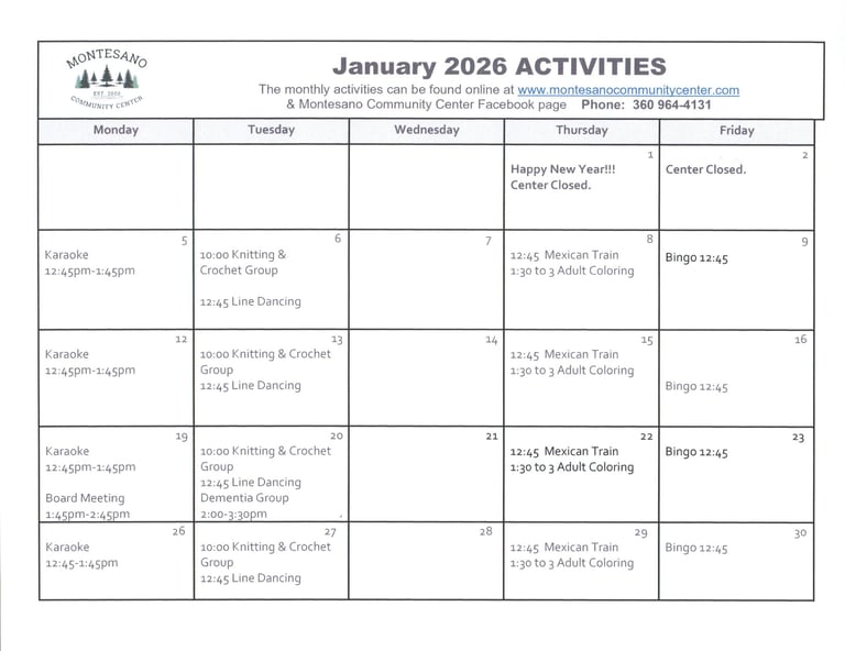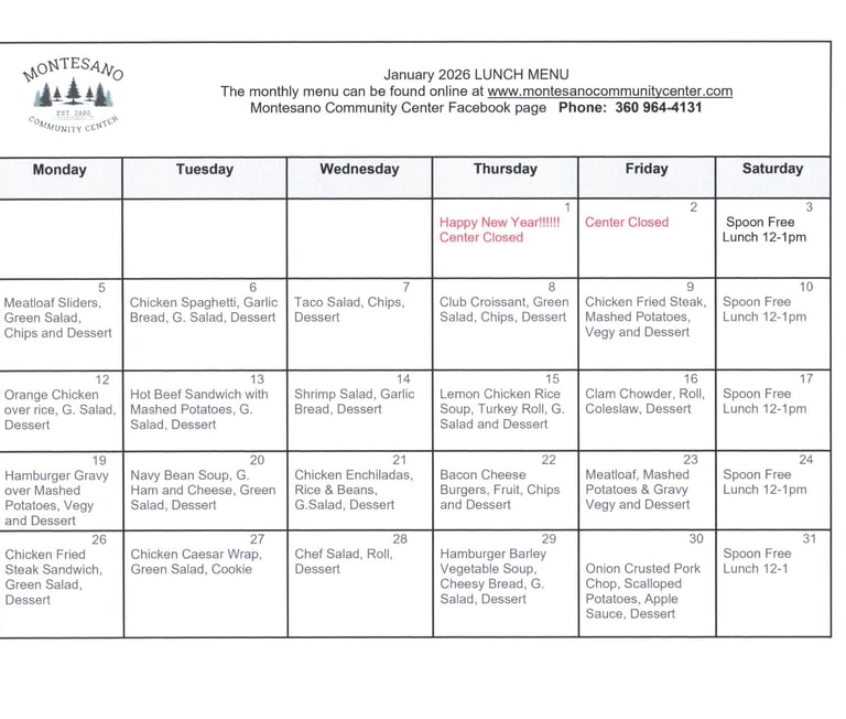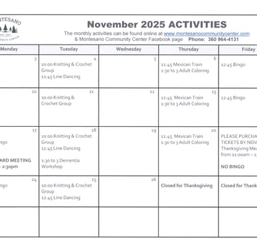 The Montesano Community Center, a dedicated 501(c)(3) non-profit, has been a cornerstone for the local community since 2000, particularly focusing on the needs of senior citizens. In 2023, the center proudly served over 20,000 nutritious meals, averaging nearly 80 meals per day. Beyond meal services, the center fosters social connections among seniors through engaging activities like bingo, board games, Mexican train and line dancing. Volunteers play a vital role by helping prepare and deliver meals at the Center and to shut-ins who are unable to visit the center, promote activities and serve as leaders on the Center's Board of Directors. The Montesano Community Center stands as a welcoming hub, encouraging camaraderie and support among the senior population, enriching their lives with both nourishment and friendship.