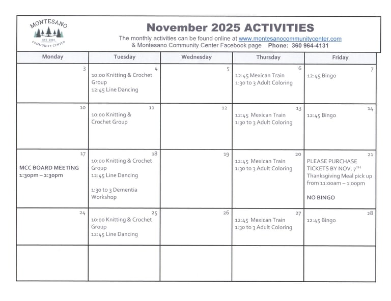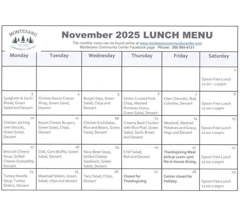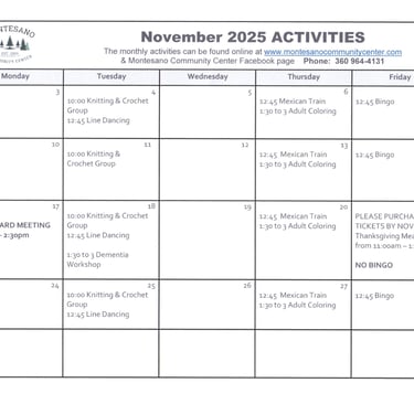 The Montesano Community Center, a dedicated 501(c)(3) non-profit, has been a cornerstone for the local community since 2000, particularly focusing on the needs of senior citizens. In 2023, the center proudly served over 20,000 nutritious meals, averaging nearly 80 meals per day. Beyond meal services, the center fosters social connections among seniors through engaging activities like bingo, board games, Mexican train and line dancing. Volunteers play a vital role by helping prepare and deliver meals at the Center and to shut-ins who are unable to visit the center, promote activities and serve as leaders on the Center's Board of Directors. The Montesano Community Center stands as a welcoming hub, encouraging camaraderie and support among the senior population, enriching their lives with both nourishment and friendship.