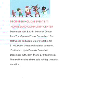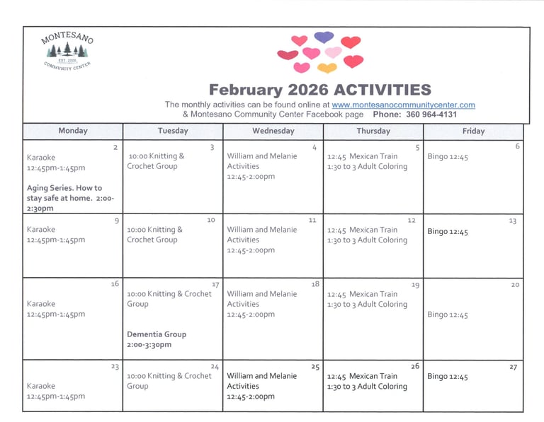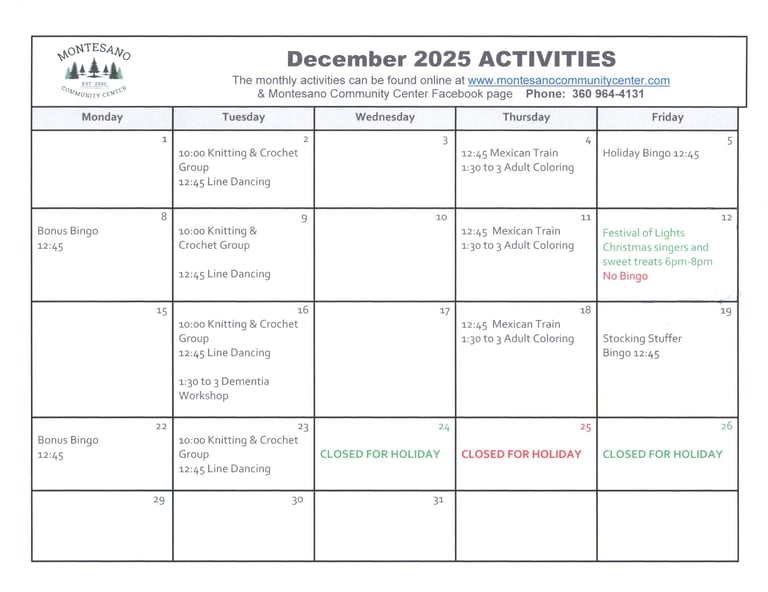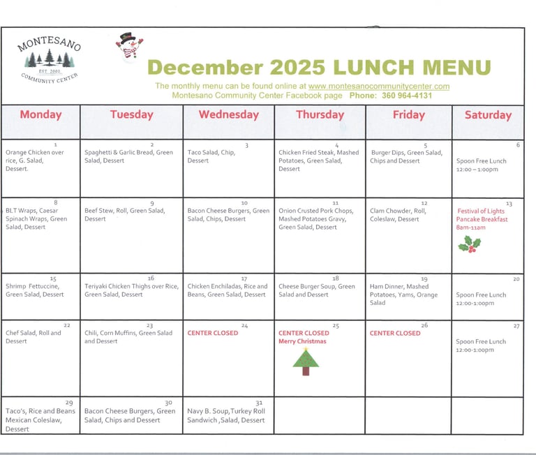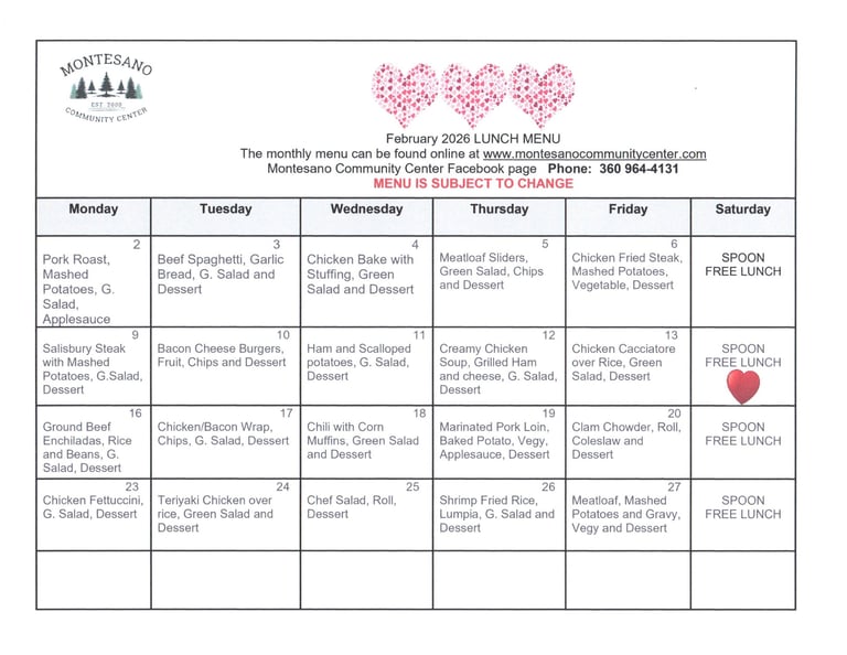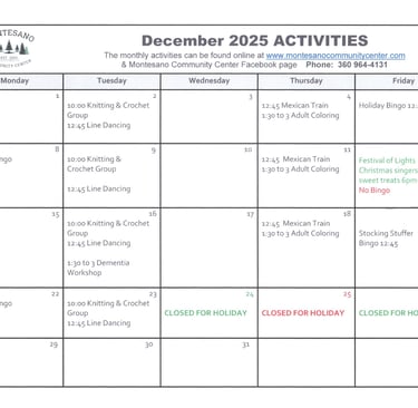 The Montesano Community Center, a dedicated 501(c)(3) non-profit, has been a cornerstone for the local community since 2000, particularly focusing on the needs of senior citizens. In 2023, the center proudly served over 20,000 nutritious meals, averaging nearly 80 meals per day. Beyond meal services, the center fosters social connections among seniors through engaging activities like bingo, board games, Mexican train and line dancing. Volunteers play a vital role by helping prepare and deliver meals at the Center and to shut-ins who are unable to visit the center, promote activities and serve as leaders on the Center's Board of Directors. The Montesano Community Center stands as a welcoming hub, encouraging camaraderie and support among the senior population, enriching their lives with both nourishment and friendship.